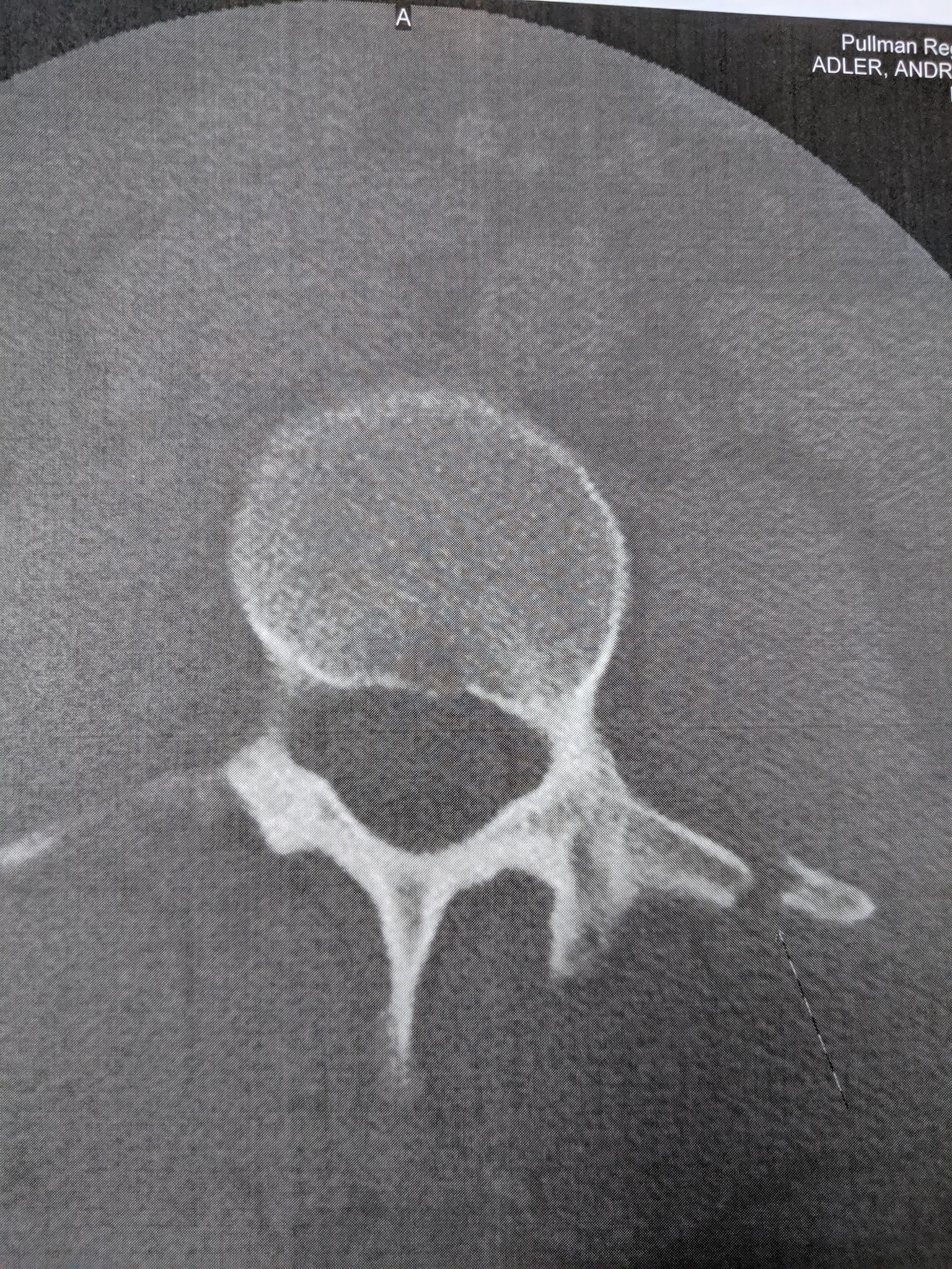 The ER doctor listened to my story and prodded my back and thought I was fine, judging by his face. When he came back with my CT results he sang a different tune. "You must be really tough, because I was pushing pretty hard on your back and you didn't seem to mind, but you have several broken bones." He proceeded to draw a picture that was a VERY BAD drawing of a pelvis. Because it was my spine! I wasn't expecting that. Hahahaha.